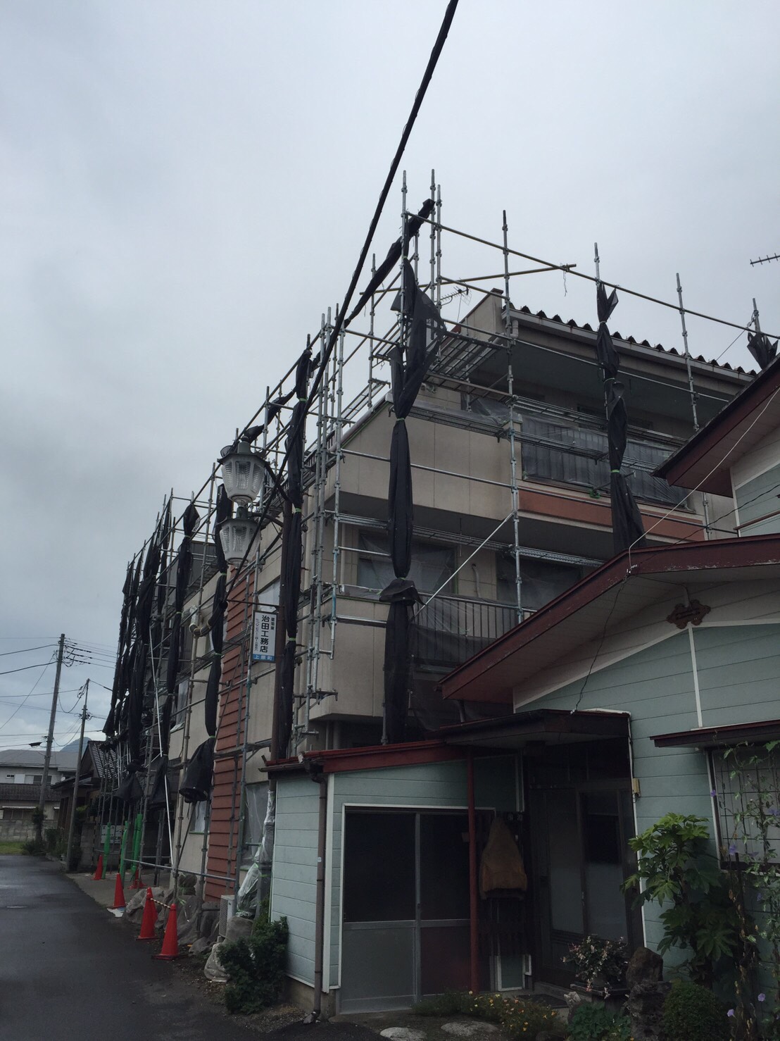 台風による風での足場倒壊を防ぐ為メッシュシートは全てたたみました。