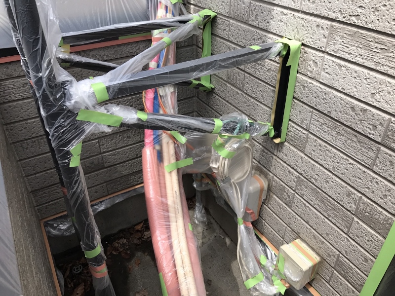 配線や配管が多く養生に大分時間を要しましたが、次の塗装の工程の事を考え「剥れずらい養生」をしました。
