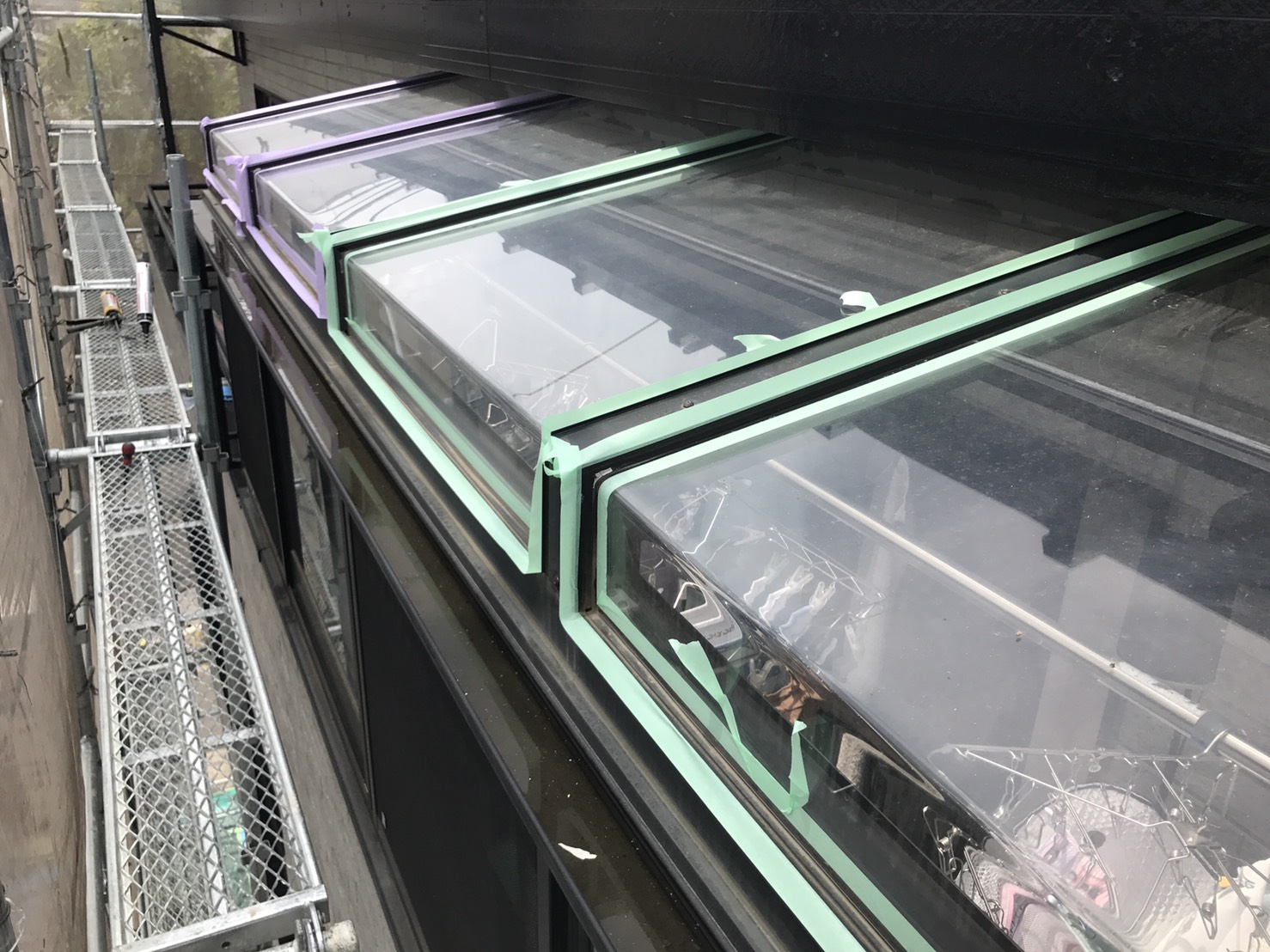 M様邸のベランダの防水工事を施工中なんですけど、下の写真はベランダのアクリル板のジョイント部の防水を行っているところ。