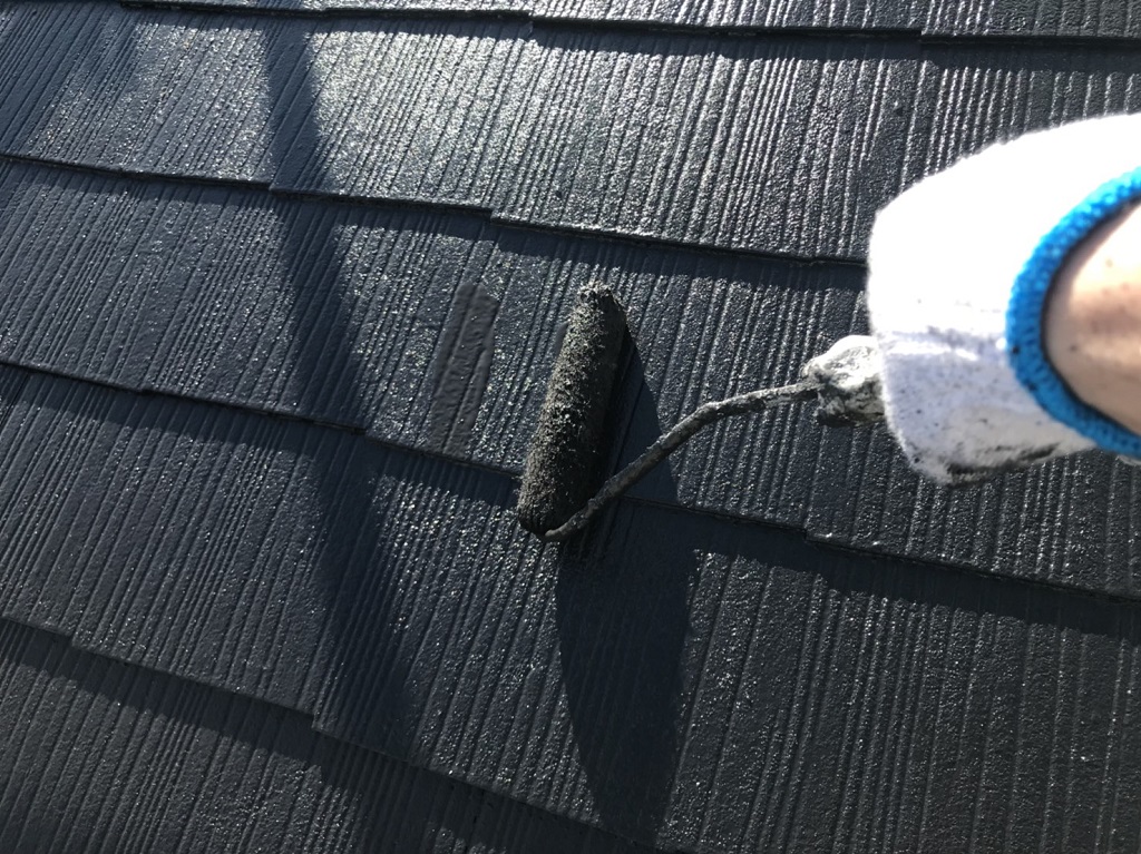 コロニアル屋根の塗装工事(上塗り中)|埼玉県さいたま市岩槻区・O様邸にて塗り替えリフォーム