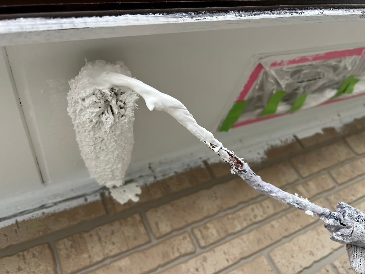 写真に見られる白くザラついた塗膜は、軒天材が下塗り塗料を吸い込んでいる状態を示しており、下地が塗料を受け止めている途中段階です。