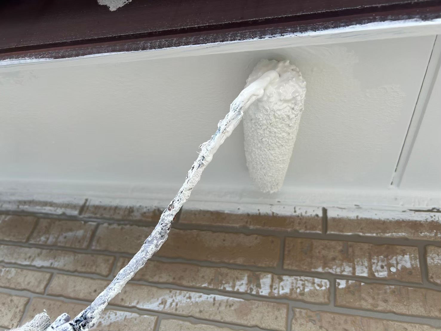 今回の下塗り作業では、ローラーに塗料をしっかり含ませ、軒天材の反応を確認しながら塗布しています。