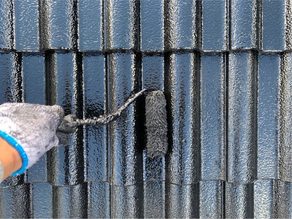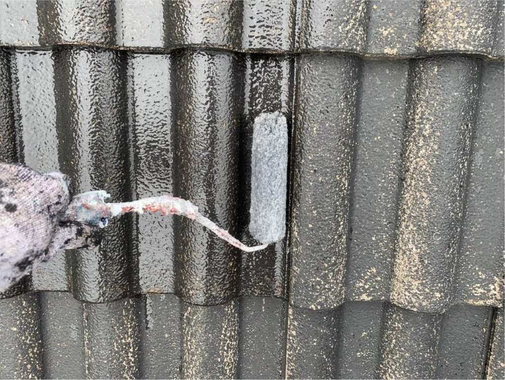 セメント瓦/モニエル瓦系屋根は、表面の凹凸が深いため、平滑な屋根材以上に塗膜厚みの確保凹凸部への塗料の入り込みが重要になります。今回の施工でも、ローラーを使って瓦の形状に沿って塗料を押し込み、各工程ごとに必要な塗膜を積み重ねています。